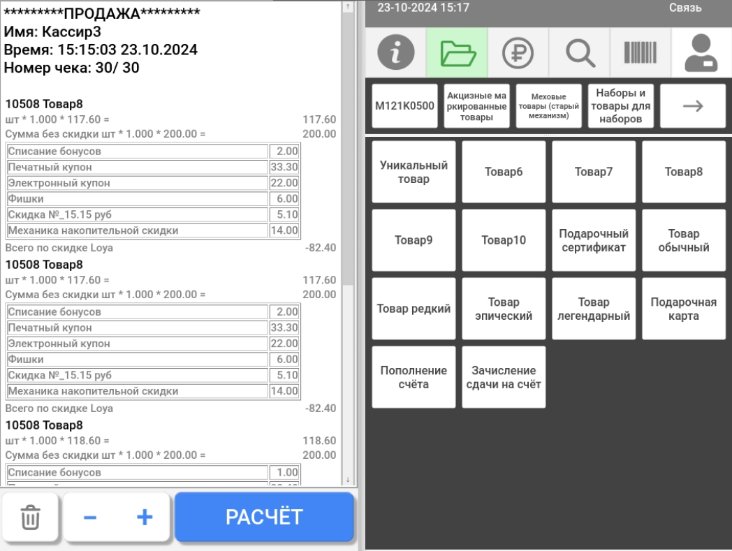 Также можно настроить функцию постоянного подытога, при которой в области товарных позиций киоска будет отображаться детализация скидок СуперМаг Loya и УКМ 4 с подведением суммарного итога: