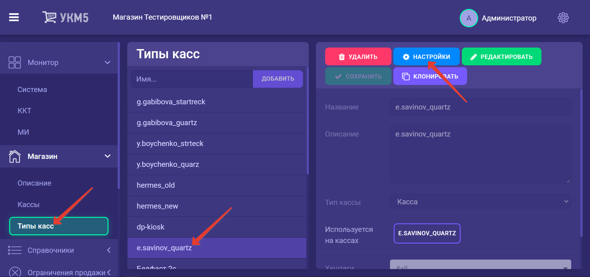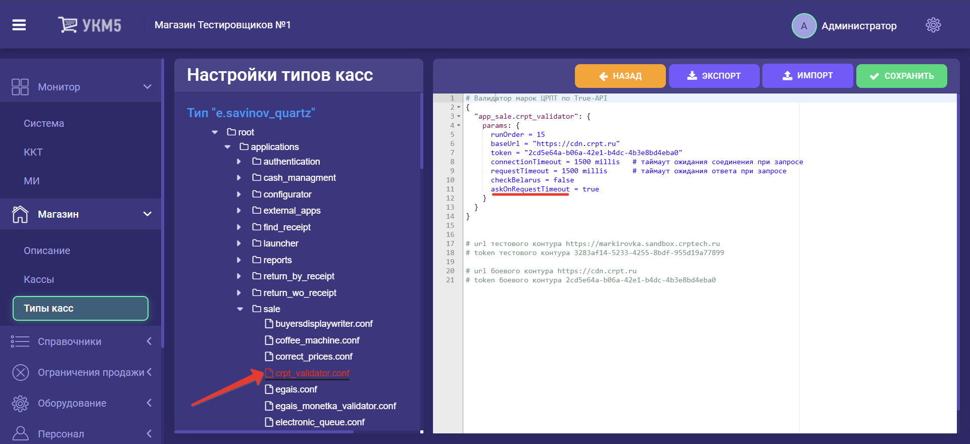 За обеспечение поддержки данного функционала, помимо настроек в специальном разделе кассового сервера УКМ 5, отвечает конфигурационный файл crpt_validator.conf, расположенный на кассовом сервере по адресу: Магазин – Типы касс, где нужно выбрать тип кассы и нажать кнопку Настройки: