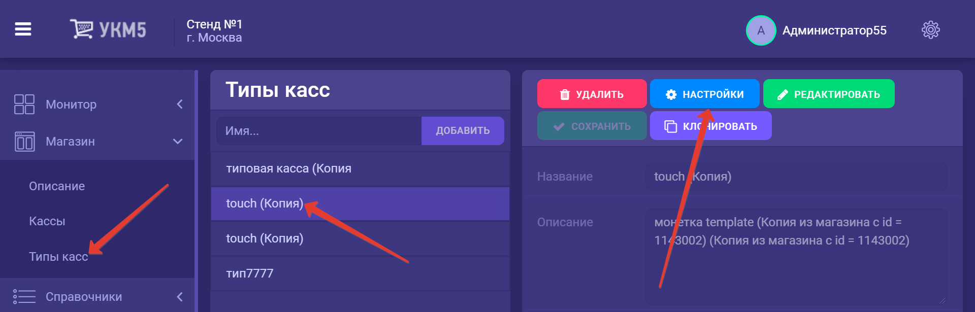 5. На кассовом сервере по адресу: Магазин – Типы касс необходимо выбрать тип кассы и нажать кнопку Настройки: