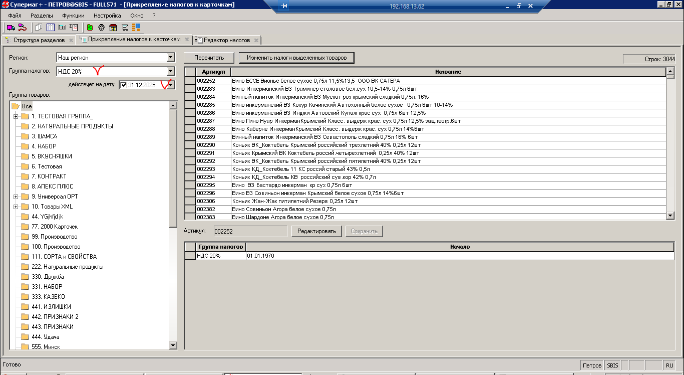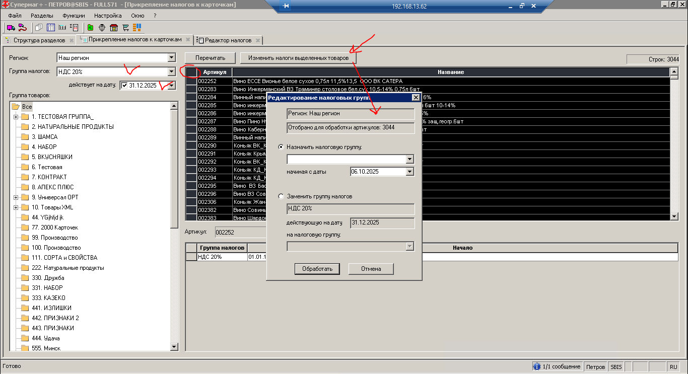 Внести изменения таким образом, чтобы новая налоговая группа для отобранных карточек навала действовать 01.01.2026г.