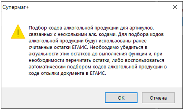 Для исполнения решения ЕГАИС о запрете актов постановки на баланс на втором регистре, в текущей версии в функции отменено создание актов постановки на баланс. В случае наличия чистых возвратов в кассовой реализации функция теперь показывает предупреждение: