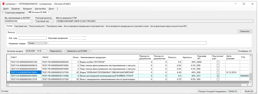 Остаток в торговом зале определяется по колонке «Итого» таблицы остатков ЕГАИС в торговом зале (Остаток – Расход по документам + приход по документам).