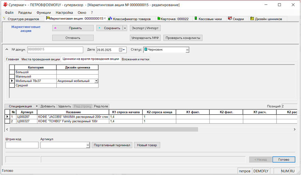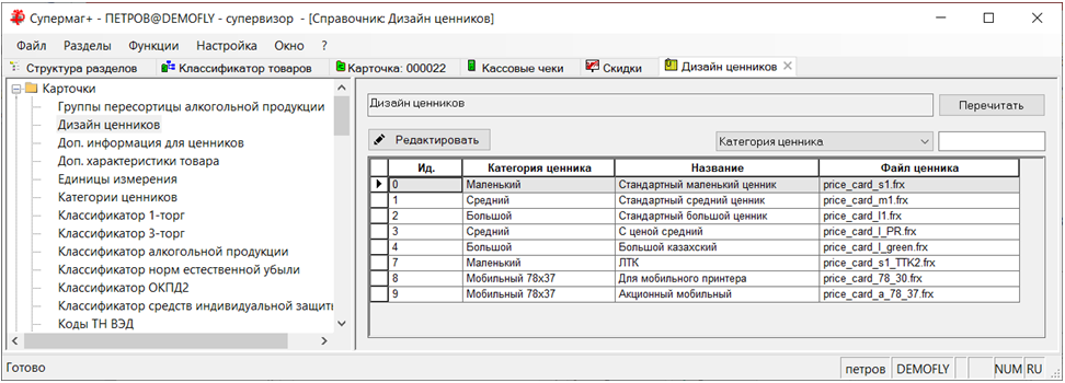 Можно объявить несколько категорий ценников для разных типов мобильных принтеров с разной шириной бумаги или для разных планок ценников стеллажей с разной высотой ценника. В программе Супермаг Мобайл можно будет выбрать для работы ту категорию ценников, которая подходит для текущих условий работы. В программе для выбора доступны категории с флагом «Только для мобильного принтера»: