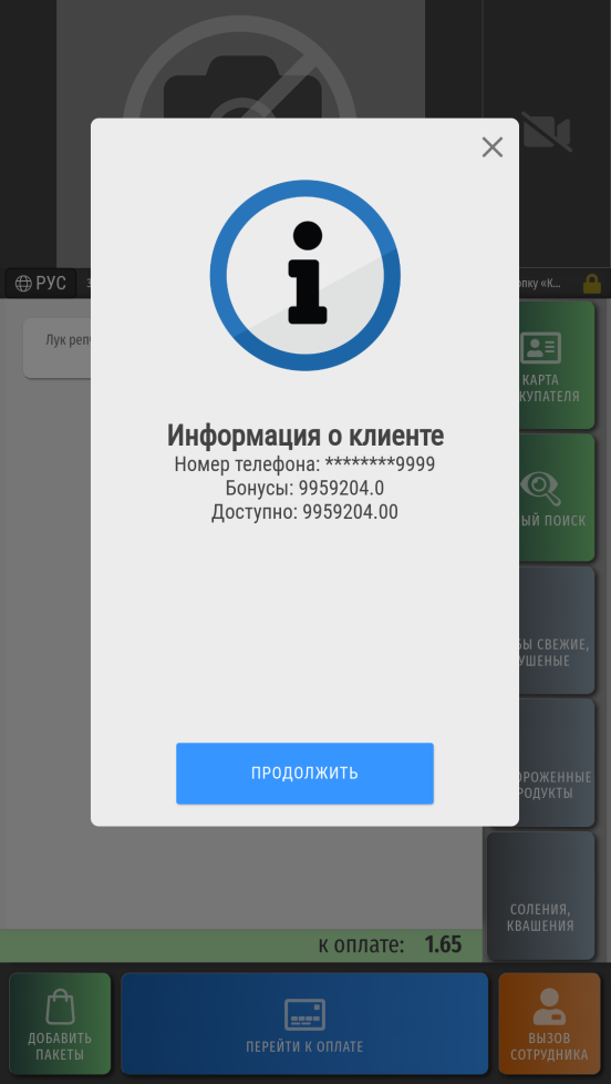 Некоторые системы лояльности могут предлагать покупателю окно с выбором количества бонусов для списания в счет оплаты покупки или с другой информацией маркетингового характера для клиента программы лояльности: