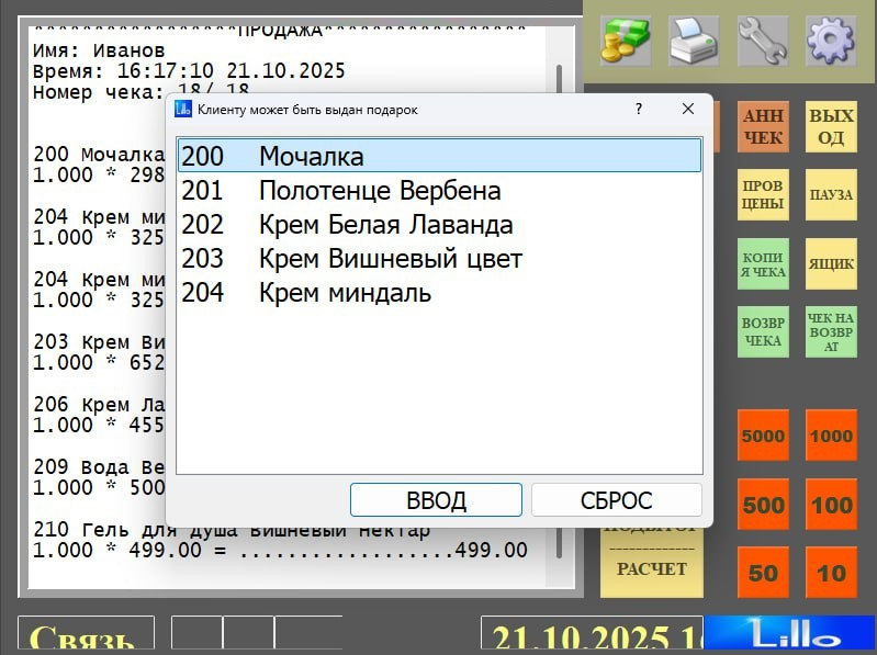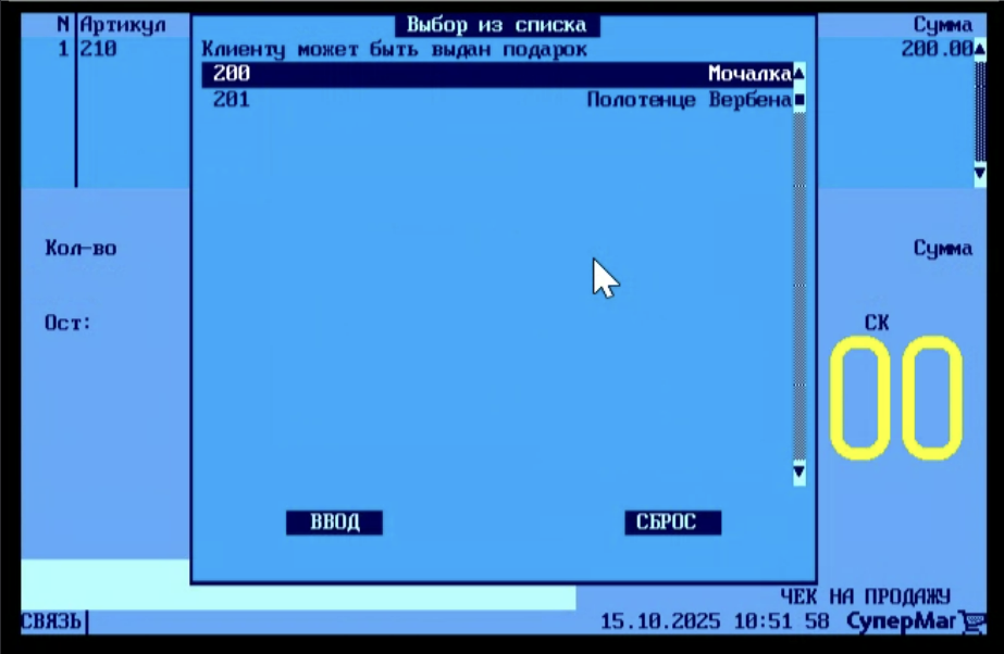 4. Затем система предложит выбор подарка, если клиент является участником рекламной кампании, предполагающей вознаграждение подарком: Как только подарок будет выбран, он автоматически попадёт в состав чека: | 1. Купоны, которые можно применить. Выберите тип купона и нажмите Ввод: 2. При выборе опции Считать штрих-код купона касса предложит зарегистрировать выданные клиенту купоны со штрихкодом, который необходимо считать сканером или ввести вручную, а затем нажать кнопку Ввод: 3. Все остальные типы купонов (электронные, печатные без штрихкодов) также будет предложено выбрать из списка: Прокрутка списка купонов (если он длинный) производится кнопками или с помощью панели прокрутки, появляющейся сбоку экрана. Выбор и использование в чеке каждого купона необходимо подтвердить нажатием кнопки OK: При выборе кнопки Отмена, купон не будет использован, а на экране вновь появится окно с общим списком доступных купонов. Если данный УПЛ может участвовать в реферальной программе с использованием промо-кодов, то возможность воспользоваться реферальным промо-кодом также будет предложена в информационном окне со списком доступных купонов: Останется только ввести промо-код и нажать Ввод: В данном окне необходимо нажать OK. Примечания: