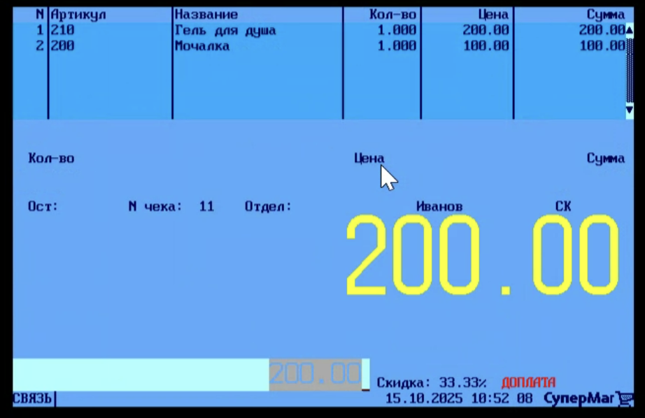 Как только штрих-код ПС будет отсканирован, оплата чека будет автоматически произведена с баланса ПС, а работа над чеком завершится. | ||