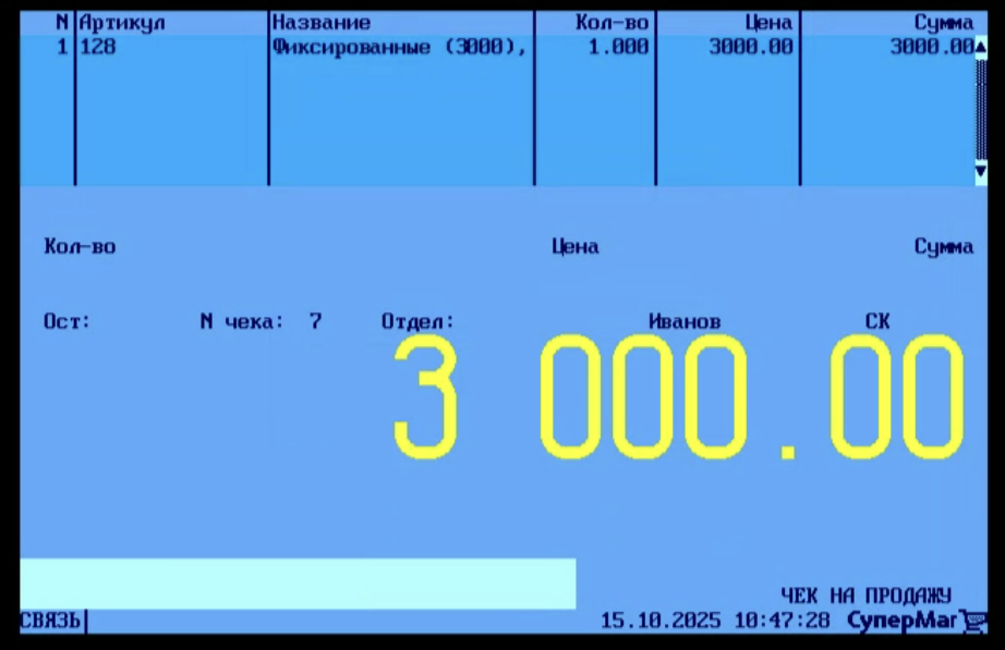 Оплата – в поле зафиксирован единственно возможный для ПС тип средства оплаты: Фискальная, т.е. данные о факте оплаты таким средством оплаты записываются в фискальную память, после оплаты печатается фискальный чек. Поле закрыто для редактирования.