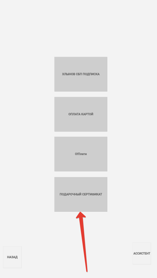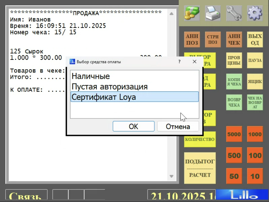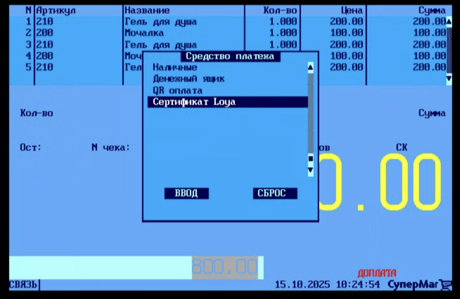 В окне выбора средства оплаты после подытога, следует выбрать Сертификат Loya (или кастомное название) и нажать кнопку Ввод/OK (для касс): | ||