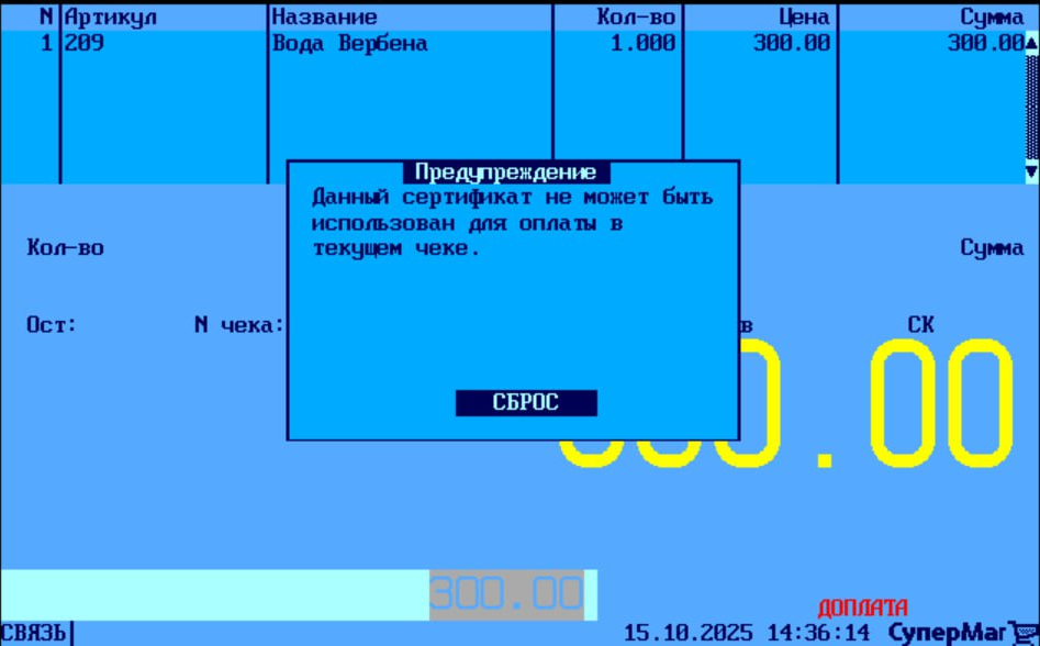 Если сертификат, с помощью которого покупатель пытается произвести оплату чека, является одноразовым, то в процессе оплаты касса никак не уведомит о том, что денежные средства, оставшиеся на балансе ПС после оплаты покупки, сгорят. То есть при оплате чека в 100 руб. с помощью одноразового сертификата с номиналом в 3000 руб. "сгорает" 3000 руб. – без предварительного сообщения кассы/киоска об этом. Во избежание такого поведения кассы, предлагаем воспользоваться функционалом подарочных сертификатов УКМ 4, где предусмотрено предупредительное сообщение о сгорании остаточного баланса одноразовых сертификатов.