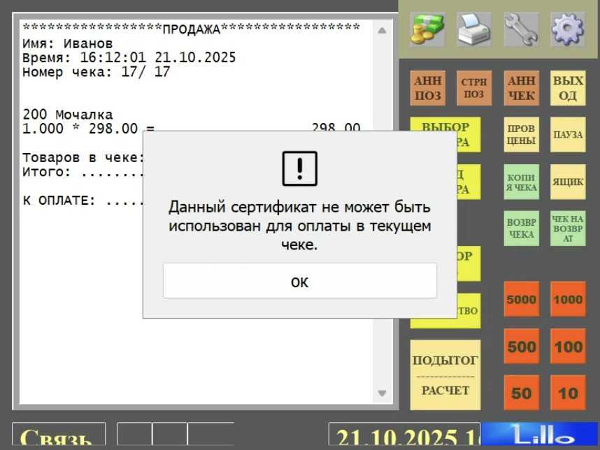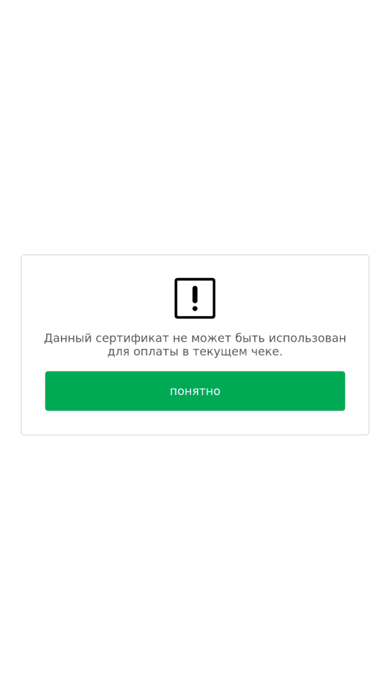 Поскольку в LOYA позволено выбирать товары, которые можно оплачивать с помощью сертификата, а в конкретном чеке этих товаров может не оказаться, то при попытке оплаты такого чека, касса сообщит о невозможности использовать подарочный сертификат: