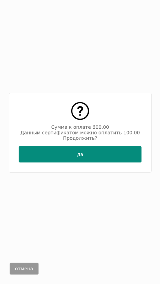 Когда в чеке есть лишь несколько товаров, пригодных к оплате с помощью ПС, касса уточнит сумму, доступную к списанию с баланса сертификата: | ||