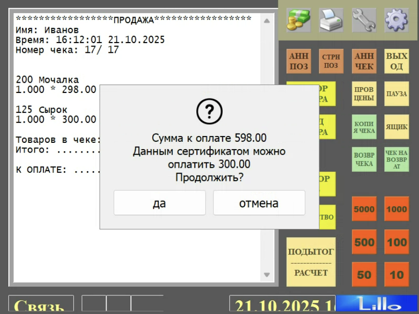 | Процедура продажи ПС инициируется в отдельном чеке нажатием специально настроенной клавиши/кнопки (на touch-кассе Lillo). Кнопка вызывает на экране кассы следующее диалоговое окно: | |