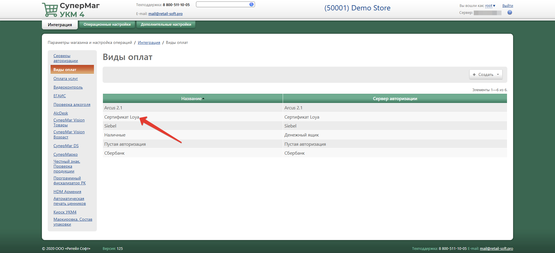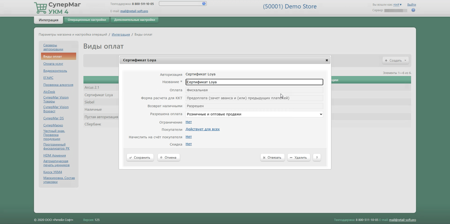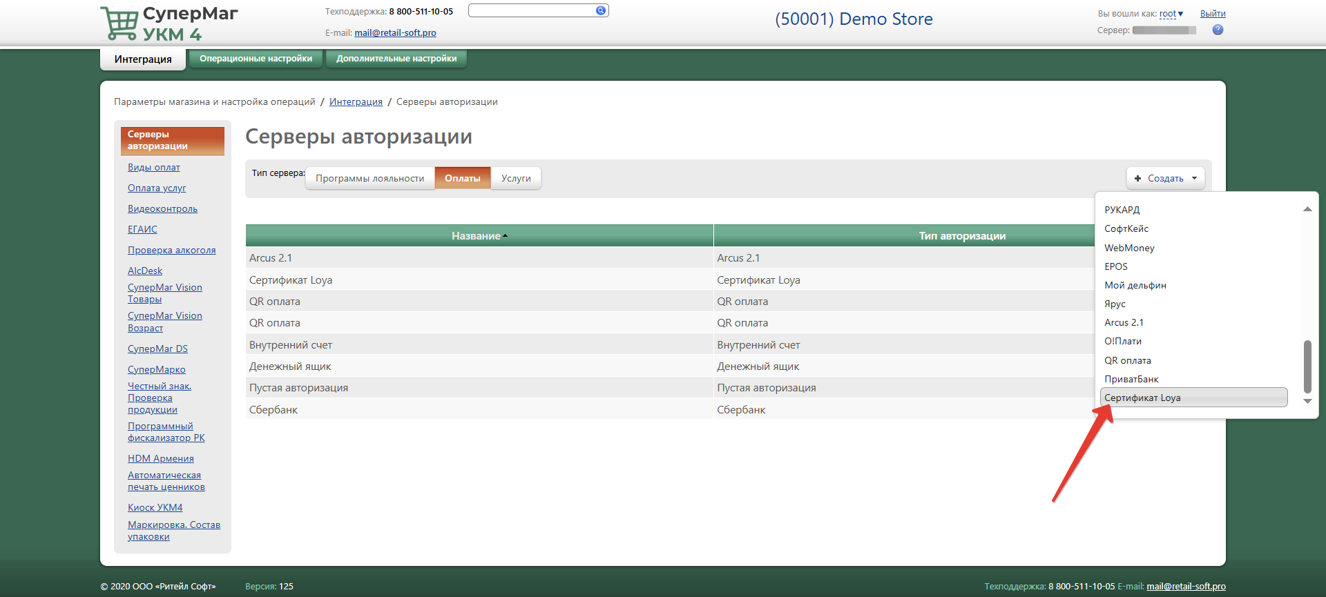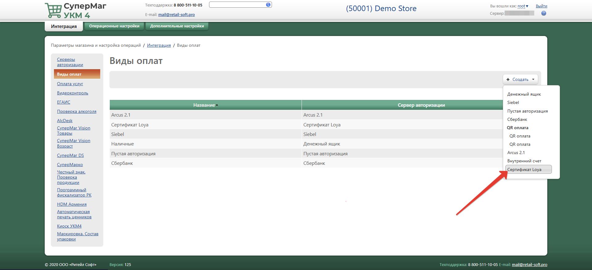 Следом за сервером авторизации, необходимо создать новый вид оплаты. Для этого, в разделе Параметры магазина и настройка операций – Интеграция – Виды оплат (вкладка слева) нужно нажать кнопку Создать и выбрать из выпадающего списка Сертификат Loya: