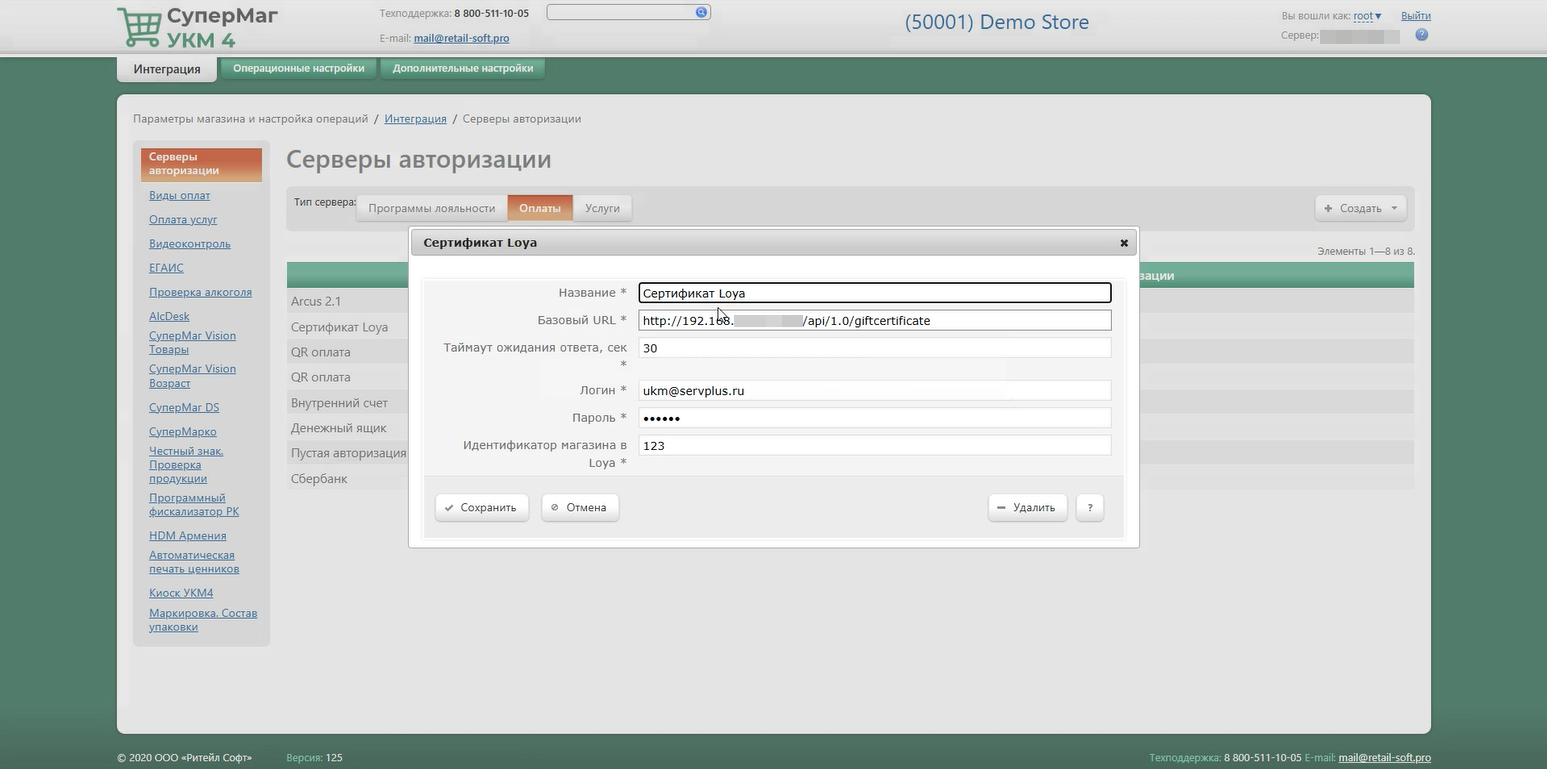 Взаимодействие с системой подарочных сертификатов LOYA настраивается отдельно от прочего функционала LOYA.