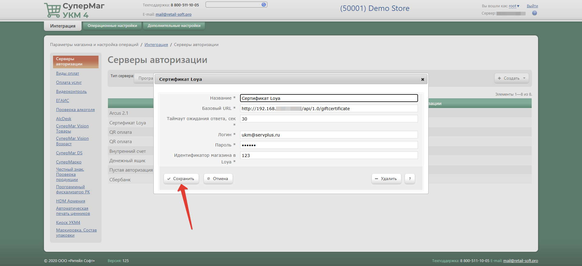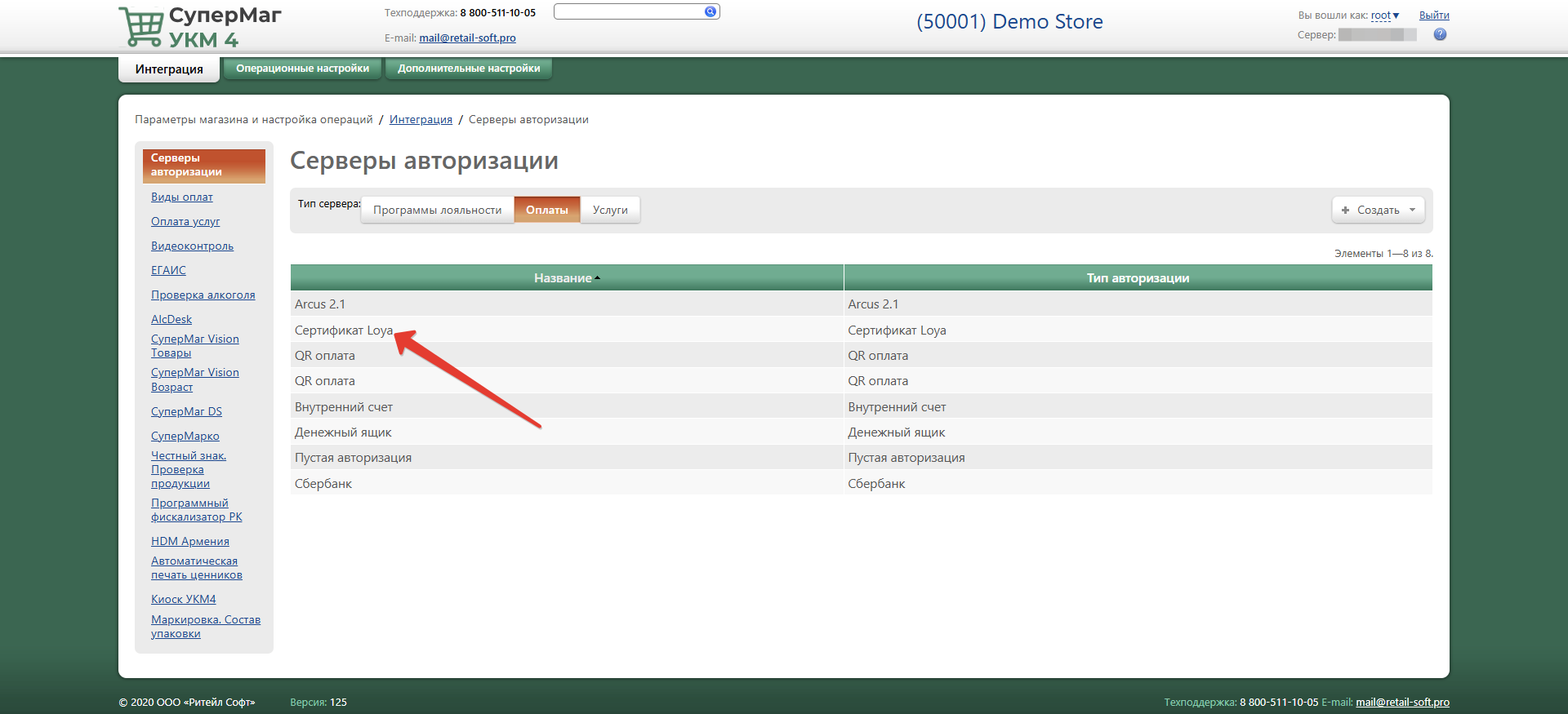 В разделе кассового сервера Параметры магазина и настройка операций – Интеграция – Серверы авторизации (вкладка слева) нужно нажать кнопку Создать и выбрать из выпадающего списка Сертификат Loya: