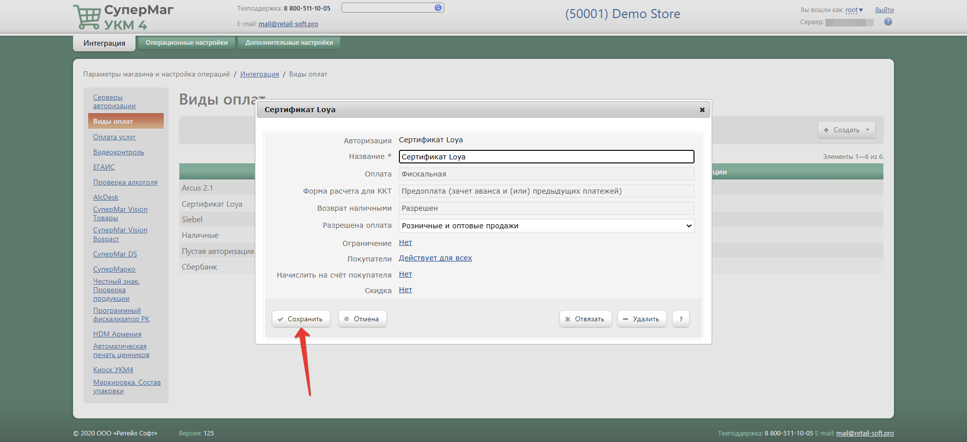 После того, как все настройки вида оплаты будут выполнены, необходимо нажать кнопку Сохранить в окне с настройками: