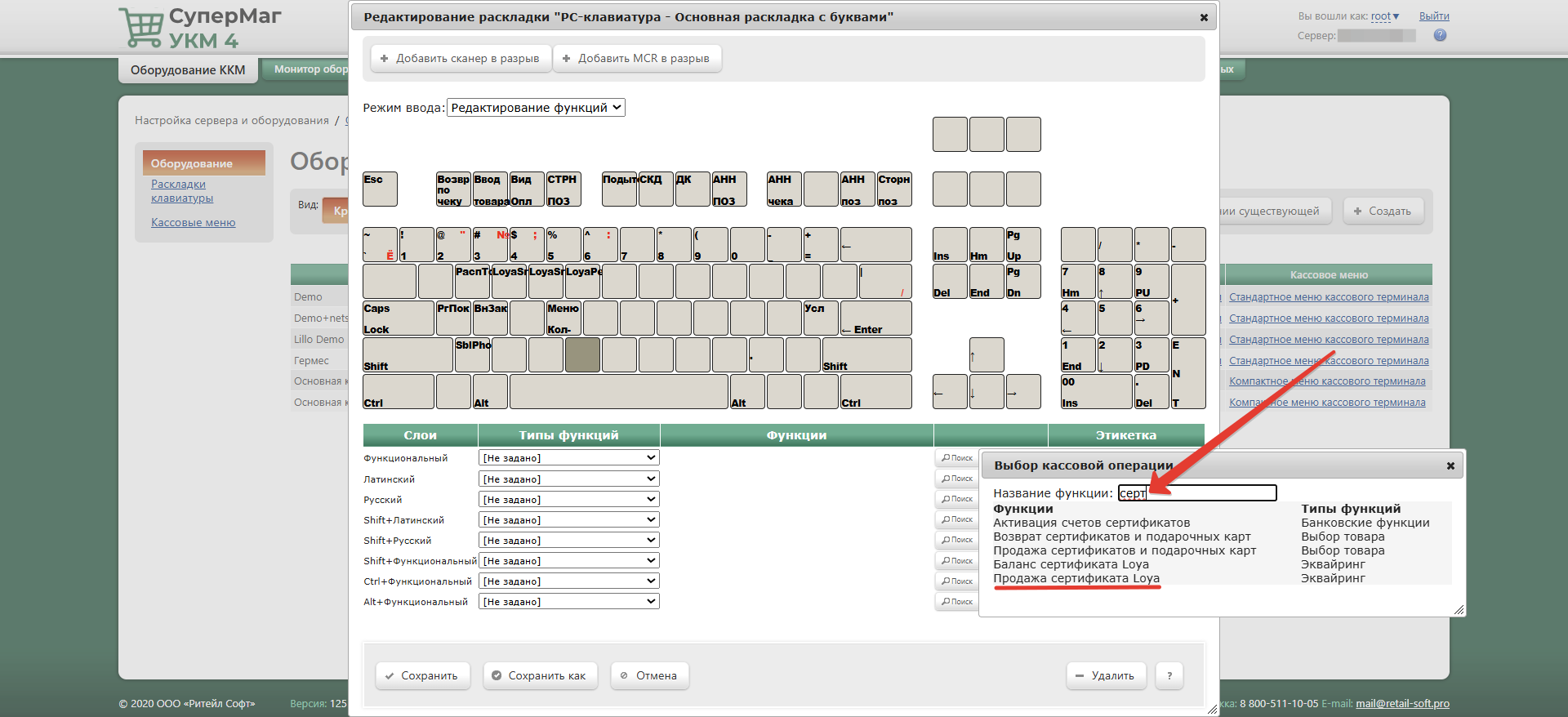 На кассе, номер купона-наклейки можно добавить в чек сканированием его штрихкода или же вручную – специальной операцией, вызываемой нажатием запрограммированной кнопки на кассе УКМ-клиент. Кнопку можно настроить на кассовом сервере УКМ 4 по адресу: Настройка сервера и оборудования – Оборудование ККМ – Раскладки клавиатуры (вкладка слева):