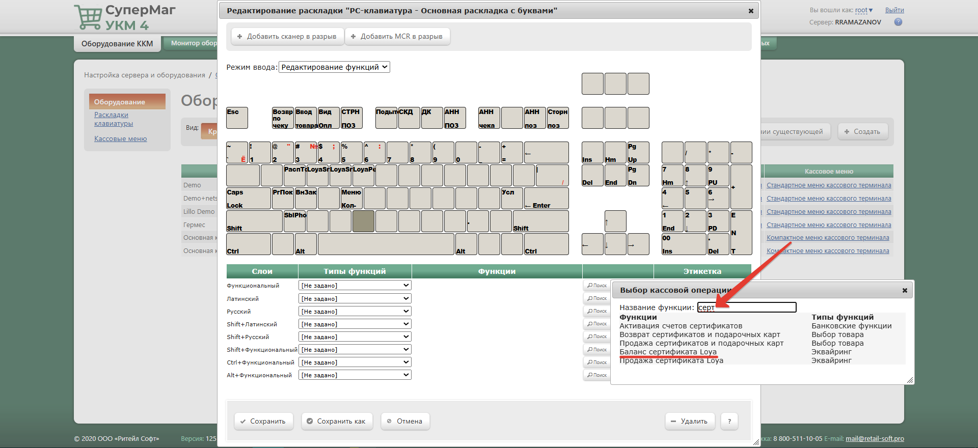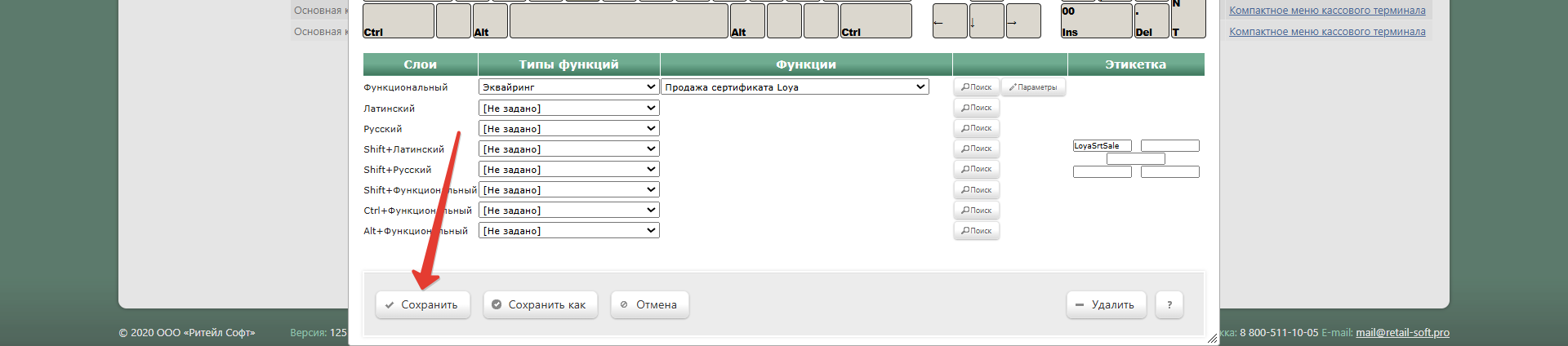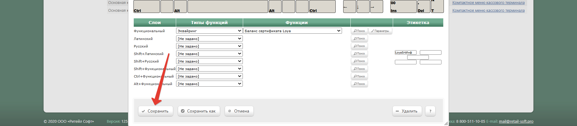 Кликнув на название раскладки, можно перейти к окну с ее настройками, где необходимо выбрать клавишу, которая будет вызывать функцию применения купона-наклейки LOYA, и в строке Функциональный под раскладкой нажать кнопку Поиск: