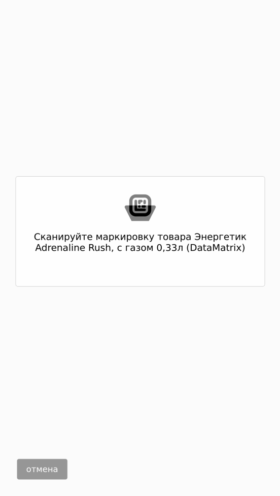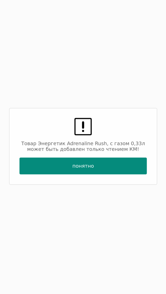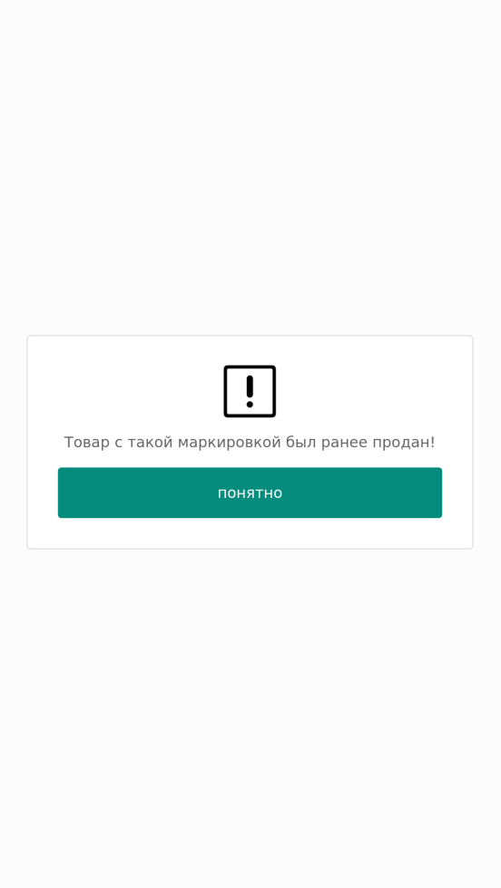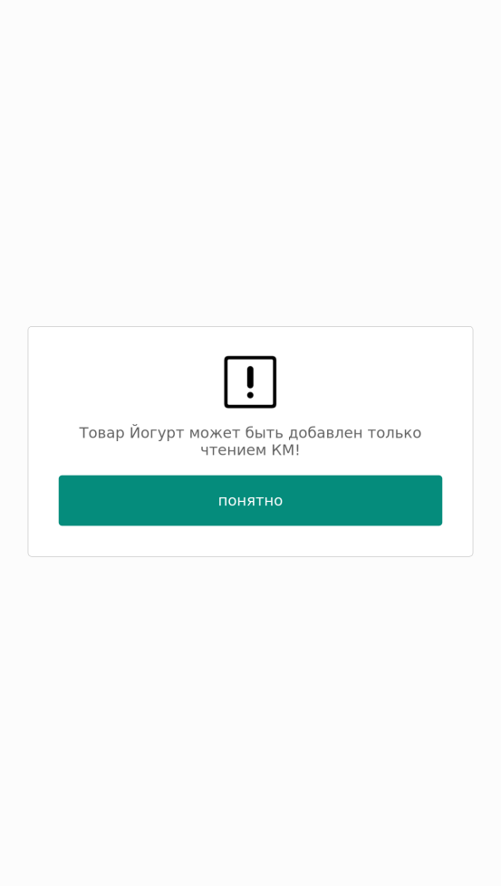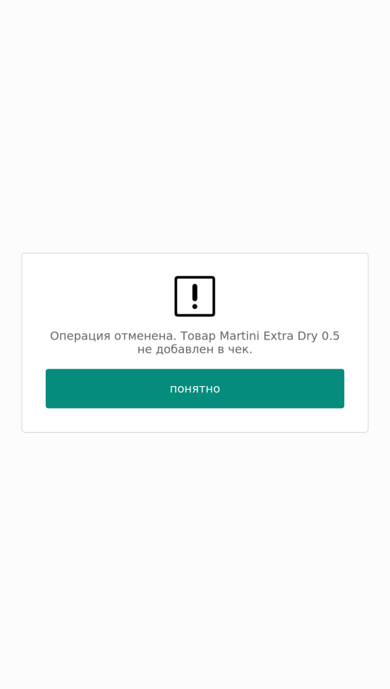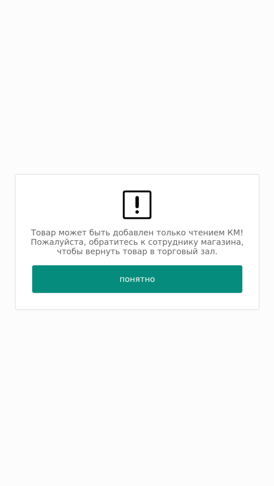 После нажатия кнопки Понятно в данном окне, система предложит покупателю попытаться считать нужную маркировку на товаре еще раз: Если отказаться от попытки и нажать кнопку Отмена, на экране появится следующее сообщение: При нажатии кнопки Понятно, произойдет автоматический вызов ассистента, на светосигнальной колонне киоска загорится красный свет, а на экране появится следующее сообщение: Подошедший на помощь сотрудник магазина должен нажать кнопку Подтвердить должность, после чего в появившемся следующем окне выбрать должность с соответствующими правами (список выбора может не отображаться, если на киоске настроено не более одной должности): Для выбранной должности необходимо ввести пароль и нажать кнопку Ok: Как только ассистент будет успешно авторизован на устройстве, автоматически произойдет возврат к экрану состава чека, где можно будет продолжить его оформление; алкогольный товар при этом в чек не попадет: Ассистент, при этом, должен изъять соответствующий товар у покупателя. В случае с алкогольными товарами, начать сканирование сразу с акцизной марки также невозможно: | После нажатия кнопки Понятно в данном окне, система предложит покупателю попытаться считать нужную маркировку на товаре еще раз: Если отказаться от попытки и нажать кнопку Отмена, на экране появится пояснение к дальнейшим действиям покупателя: При нажатии кнопки Понятно, произойдет автоматический вызов ассистента, на светосигнальной колонне киоска загорится красный свет, а на экране появится следующее сообщение: Подошедший на помощь сотрудник магазина должен нажать кнопку Подтвердить должность, после чего в появившемся следующем окне выбрать должность с соответствующими правами (список выбора может не отображаться, если на киоске настроено не более одной должности): Для выбранной должности необходимо ввести пароль и нажать кнопку Ok: Как только ассистент будет успешно авторизован на устройстве, на экране появится следующее сообщение: Ассистент должен изъять соответствующий товар у покупателя. | После нажатия кнопки Понятно в данном окне, система предложит покупателю попытаться считать нужную маркировку на товаре еще раз: Если отказаться от попытки и нажать кнопку Отмена, на экране появится пояснение к дальнейшим действиям покупателя: При нажатии кнопки Понятно, произойдет автоматический вызов ассистента, на светосигнальной колонне киоска загорится красный свет, а на экране появится следующее сообщение: Подошедший на помощь сотрудник магазина должен нажать кнопку Подтвердить должность, после чего в появившемся следующем окне выбрать должность с соответствующими правами (список выбора может не отображаться, если на киоске настроено не более одной должности): Для выбранной должности необходимо ввести пароль и нажать кнопку Ok: Как только ассистент будет успешно авторизован на устройстве, на экране появится следующее сообщение: Ассистент должен изъять соответствующий товар у покупателя. |