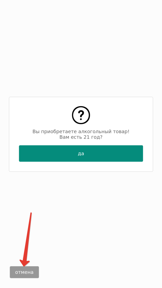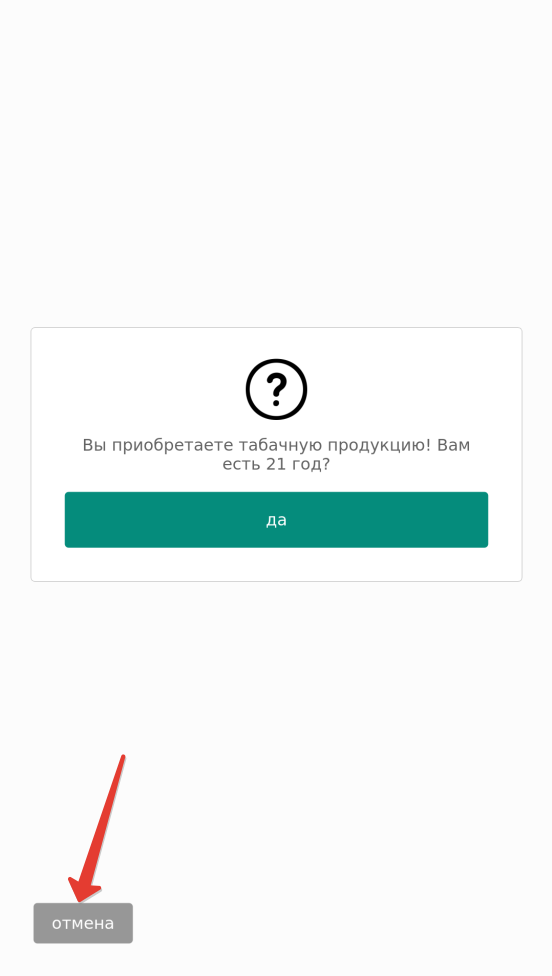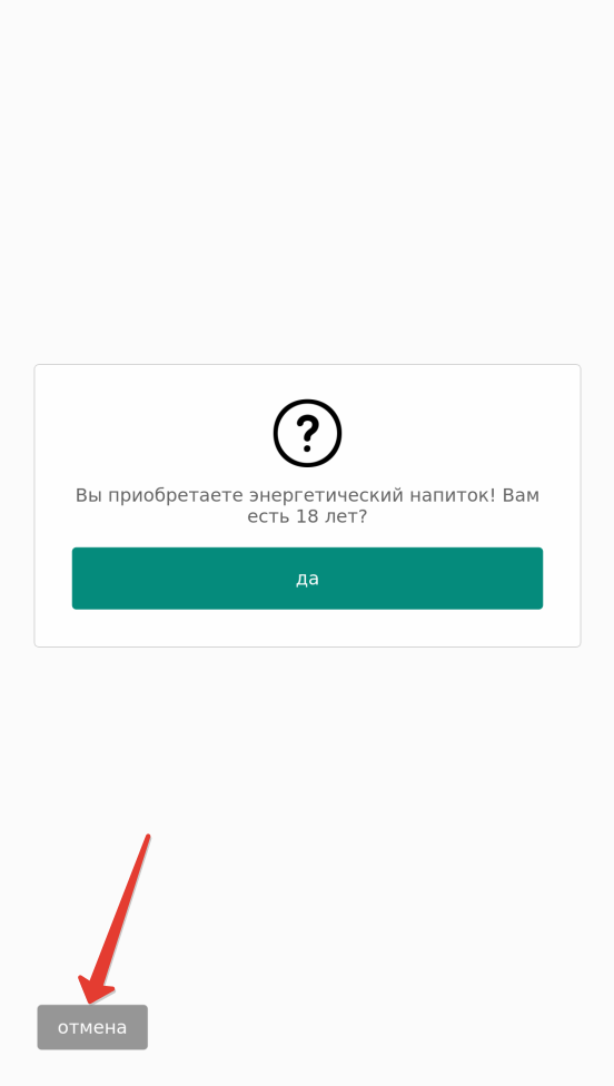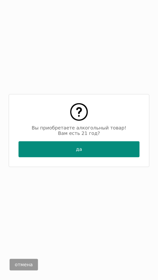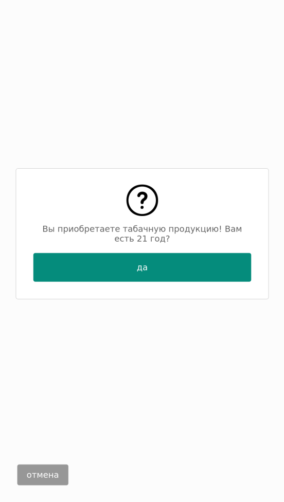 Нажатием кнопки Да покупатель подтверждает, что его возраст соответствует требованиям закона, и на экран выводится запрос на сканирование акцизной марки изделия: При успешном сканировании акцизной марки, товар попадает в чек. Алгоритм, срабатывающий при выборе опции Отмена, описан выше. В окне подтверждения возраста также можно нажать кнопку Отмена, если покупатель не имеет при себе документов, подтверждающих возраст: При нажатии кнопки Отмена, на экране возникнет следующее сообщение, сопровождающееся автоматическим вызовом сотрудника магазина (на свето-сигнальной колонне киоска зажигается красный фонарь): После нажатия кнопки Понятно, на экране возникает следующее сообщение: Подошедший на помощь сотрудник магазина должен изъять у покупателя алкогольный товар, который тот отказался зарегистрировать в чеке. После этого сотруднику нужно нажать кнопку Подтвердить должность в окне выше и в появившемся следующем окне выбрать должность с соответствующими правами (список выбора может не отображаться, если на киоске настроено не более одной должности): Для выбранной должности необходимо ввести пароль и нажать кнопку Ok: Как только ассистент будет успешно авторизован на устройстве, автоматически произойдет возврат к экрану состава чека, где можно продолжить его оформление; алкогольный товар при этом не добавится в чек и должен быть изъят у покупателя: Если, в ходе дальнейшей работы над этим же чеком, в него вновь попробовать добавить алкогольный товар, то киоск отобразит следующее предупреждение: Успешно продать алкогольный товар удастся только в новом чеке, если ассистент подтвердит в нем возраст покупателя. | Нажатием кнопки Да покупатель подтверждает, что его возраст соответствует требованиям закона, и товар попадает в чек. Алгоритм, срабатывающий при выборе опции Отмена, описан выше. В окне подтверждения возраста также можно нажать кнопку Отмена, если покупатель не имеет при себе документов, подтверждающих возраст:
