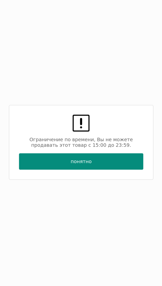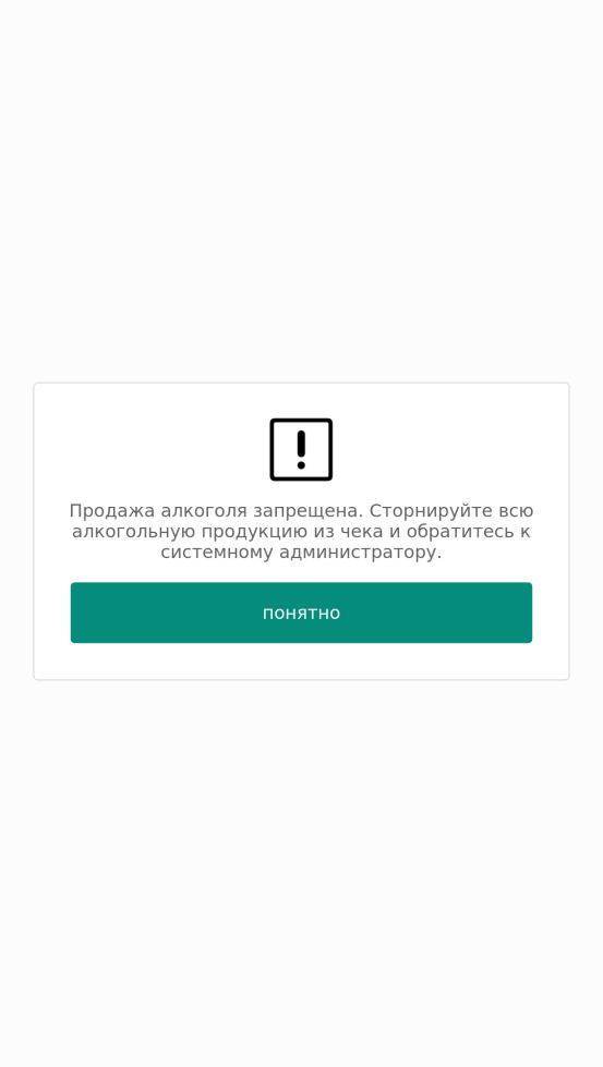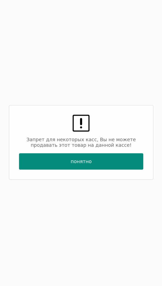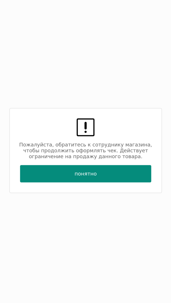 При появлении на экране данного сообщения, происходит автоматический вызов сотрудника магазина (на светосигнальной колонне устройства загорается красный фонарь). После нажатия кнопки Понятно, на экране возникает следующее сообщение: Сотрудник магазина, подошедший на помощь, должен нажать кнопку Подтвердить должность в окне выше, после чего в появившемся следующем окне выбрать должность с соответствующими правами (список выбора может не отображаться, если на киоске настроено не более одной должности): Для выбранной должности необходимо ввести пароль и нажать кнопку Ok: Как только ассистент будет успешно авторизован на устройстве, ему следует изъять запрещенный к продаже товар у покупателя и нажать кнопку Понятно в следующем окне: После нажатия кнопки Понятно, произойдет автоматический переход на экран состава чека. Ассистенту придется сторнировать запрещенный к продаже алкогольный товар, чтобы покупатель смог оплатить данный чек. Помимо описанных выше стандартных ограничений, для алкогольных товаров можно назначить еще ряд специфических ограничений, которые будут сопровождаться при срабатывании следующим информационным окном с автоматическим вызовом сотрудника магазина для изъятия алкогольного товара: | При появлении на экране данного сообщения, происходит автоматический вызов сотрудника магазина (на светосигнальной колонне устройства загорается красный фонарь). После нажатия кнопки Понятно, на экране возникает следующее сообщение: Сотрудник магазина, подошедший на помощь, должен нажать кнопку Подтвердить должность в окне выше, после чего в появившемся следующем окне выбрать должность с соответствующими правами (список выбора может не отображаться, если на киоске настроено не более одной должности): Для выбранной должности необходимо ввести пароль и нажать кнопку Ok: Как только ассистент будет успешно авторизован на устройстве, ему следует изъять запрещенный к продаже товар у покупателя и нажать кнопку Понятно в следующем окне: После нажатия кнопки Понятно, произойдет автоматический переход на экран состава чека. Ассистенту придется сторнировать запрещенный к продаже табачный товар, чтобы покупатель смог оплатить данный чек. | При появлении на экране данного сообщения, происходит автоматический вызов сотрудника магазина (на светосигнальной колонне устройства загорается красный фонарь). После нажатия кнопки Понятно, на экране возникает следующее сообщение: Сотрудник магазина, подошедший на помощь, должен нажать кнопку Подтвердить должность в окне выше, после чего в появившемся следующем окне выбрать должность с соответствующими правами (список выбора может не отображаться, если на киоске настроено не более одной должности): Для выбранной должности необходимо ввести пароль и нажать кнопку Ok: Как только ассистент будет успешно авторизован на устройстве, ему следует изъять запрещенный к продаже товар у покупателя и нажать кнопку Понятно в следующем окне: После нажатия кнопки Понятно, произойдет автоматический переход на экран состава чека. Ассистенту придется сторнировать запрещенный к продаже маркированный товар, чтобы покупатель смог оплатить данный чек. |