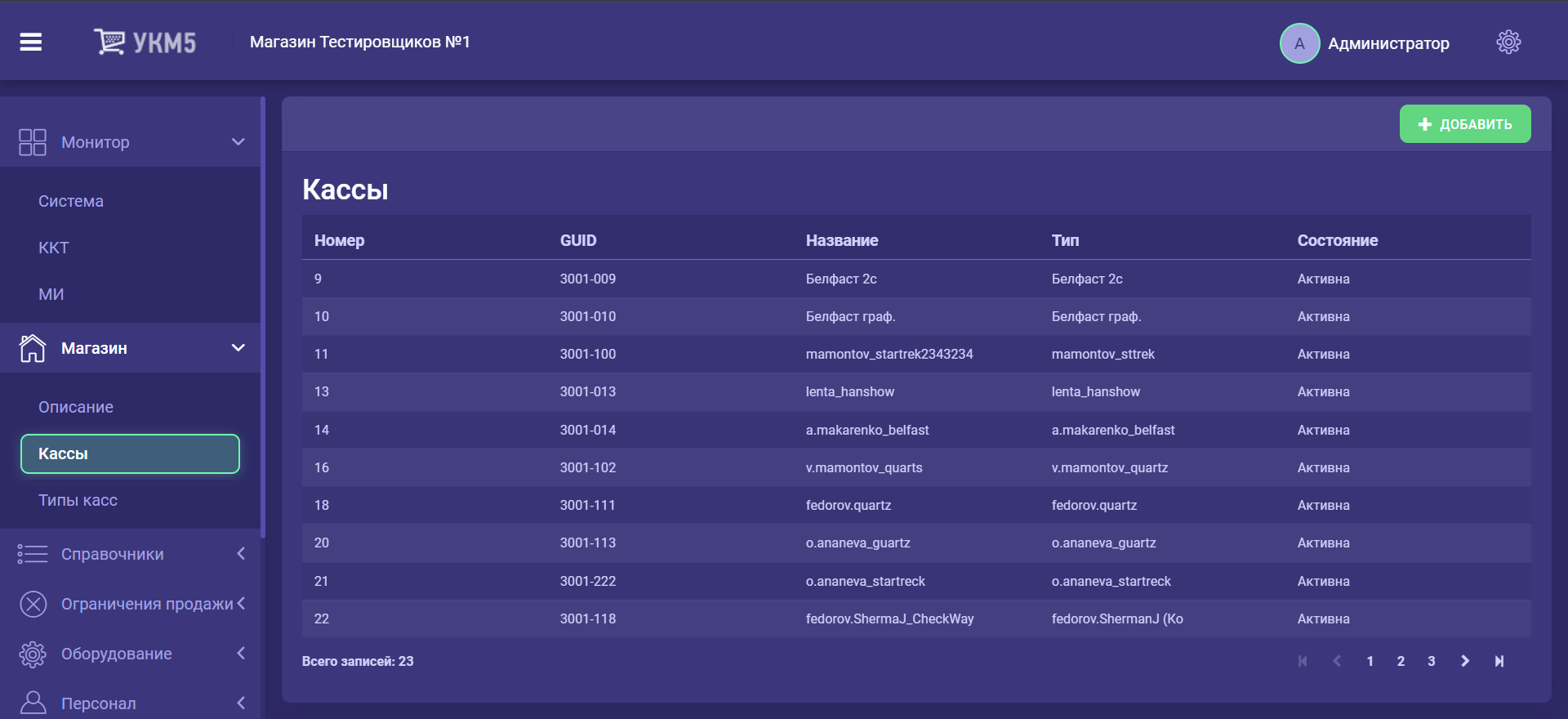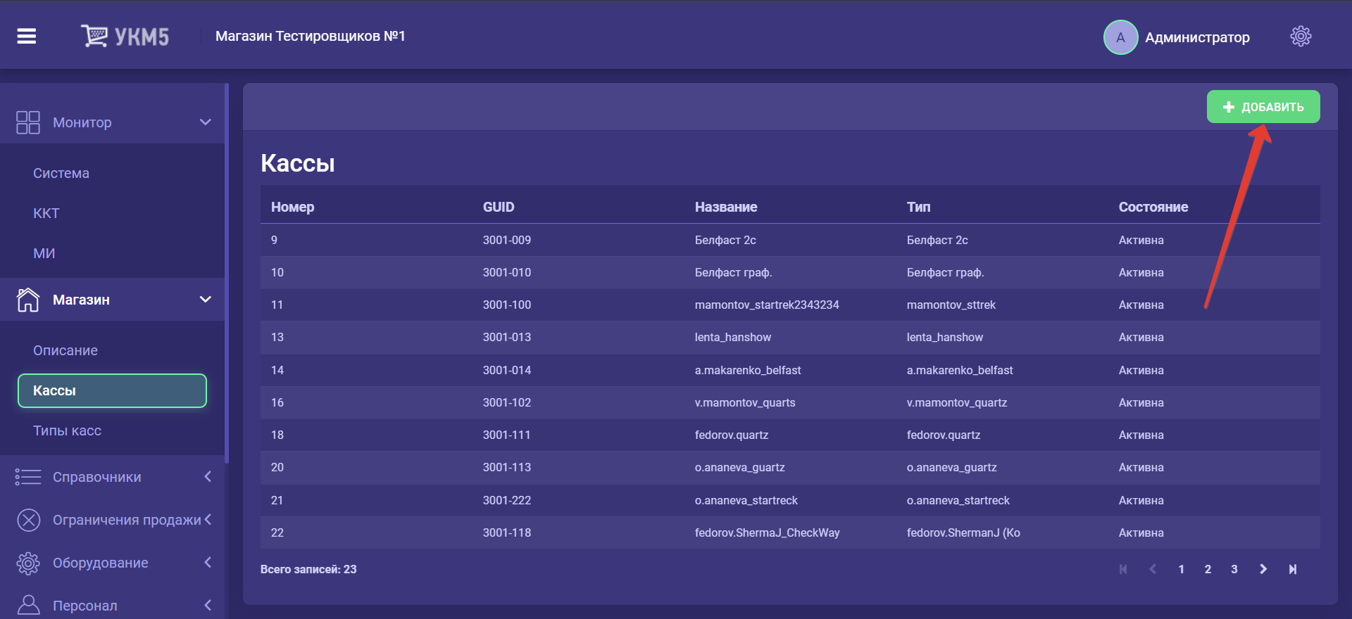 В списке касс можно добавить запись о новой кассе. Для этого надо нажать кнопку Добавить: