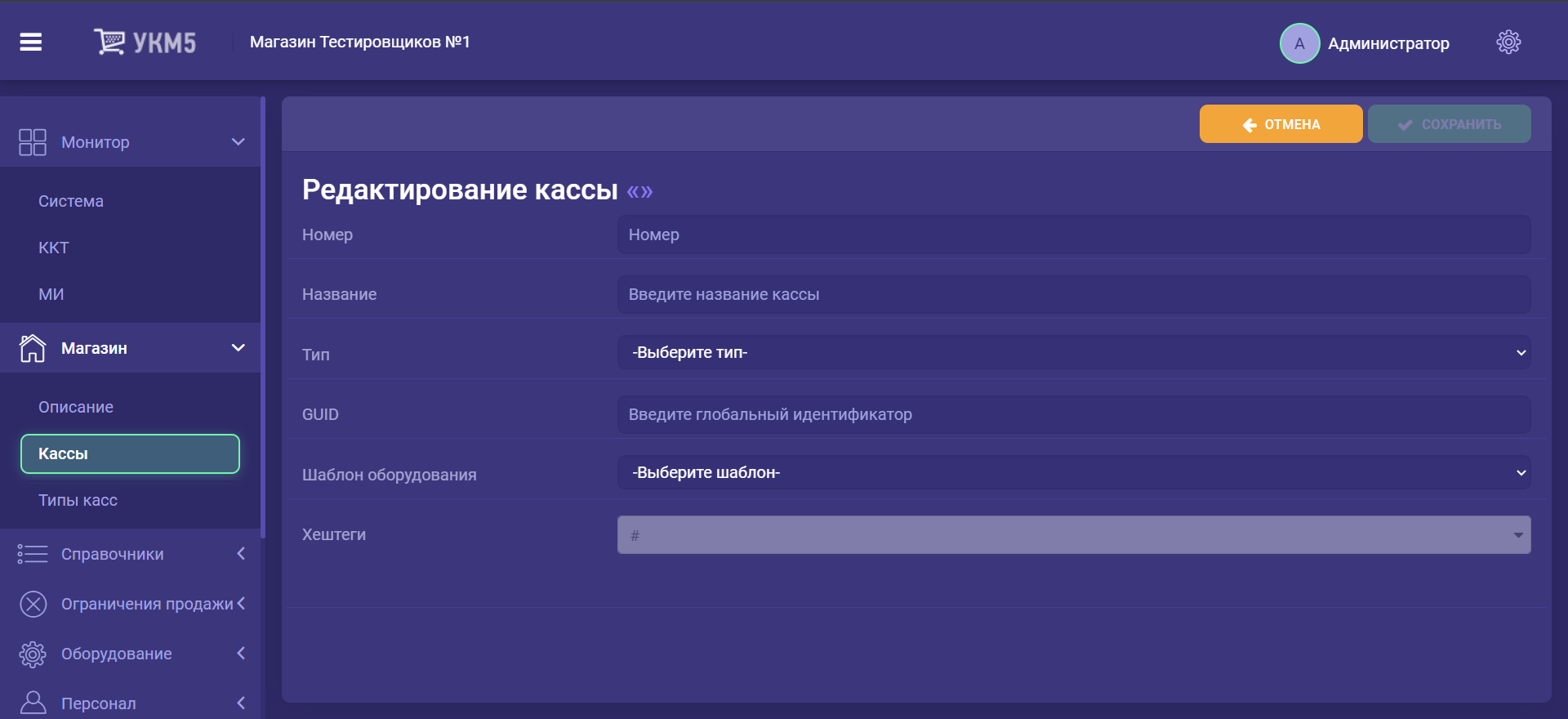 - Хештеги – задаются в произвольной форме и с нерегламентированным значением. При наличии уже созданных хештегов для других касс, значение будет возможно выбрать из выпадающего списка. Хештеги играют роль в процессах поиска касс и тиражирования настроек.