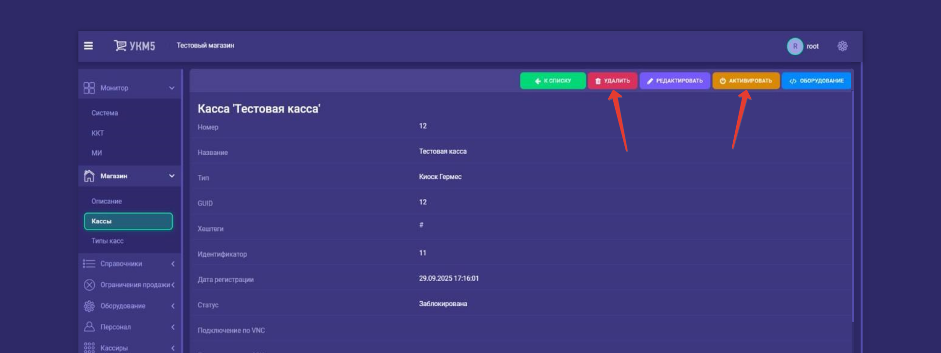 При просмотре заблокированной кассы становятся доступными опции повторной активации и удаления: