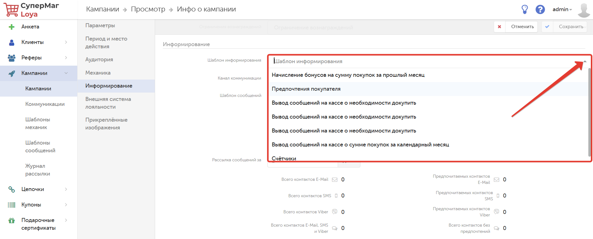 В разделе Кампании приводится список всех маркетинговых акций, когда-либо созданных в рамках торговой сети пользователя: