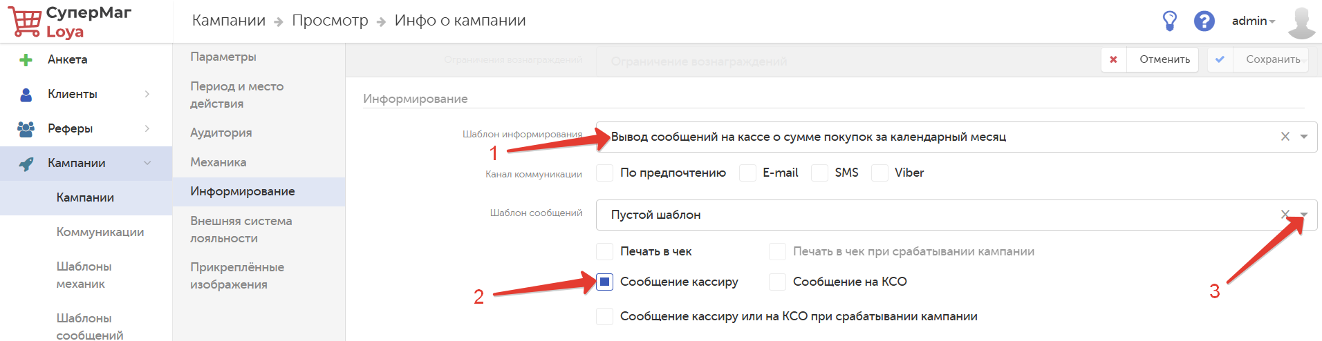 При выборе опций оповещения кассира (например, Вывод сообщений на кассе о необходимости докупить или Вывод сообщений на кассе о сумме покупок за календарный месяц) также требуется указать шаблон информационного сообщения для кассира и активировать его вывод: