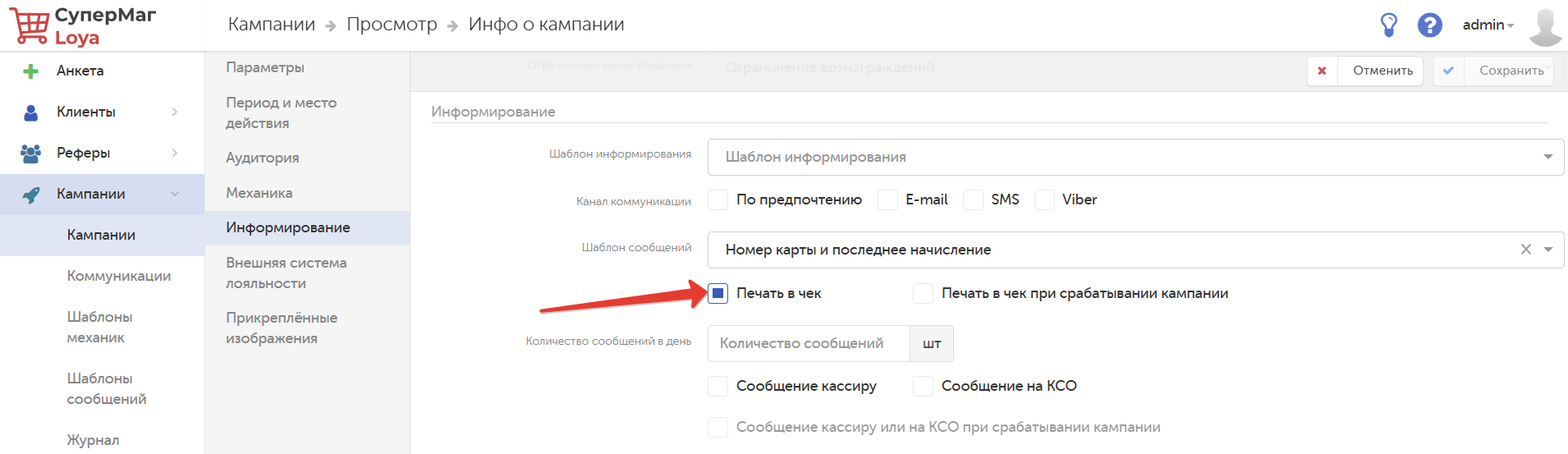 Опция Печать в чек обеспечивает вывод сообщения в чеки всех УПЛ, входящих в целевую аудиторию данной кампании: