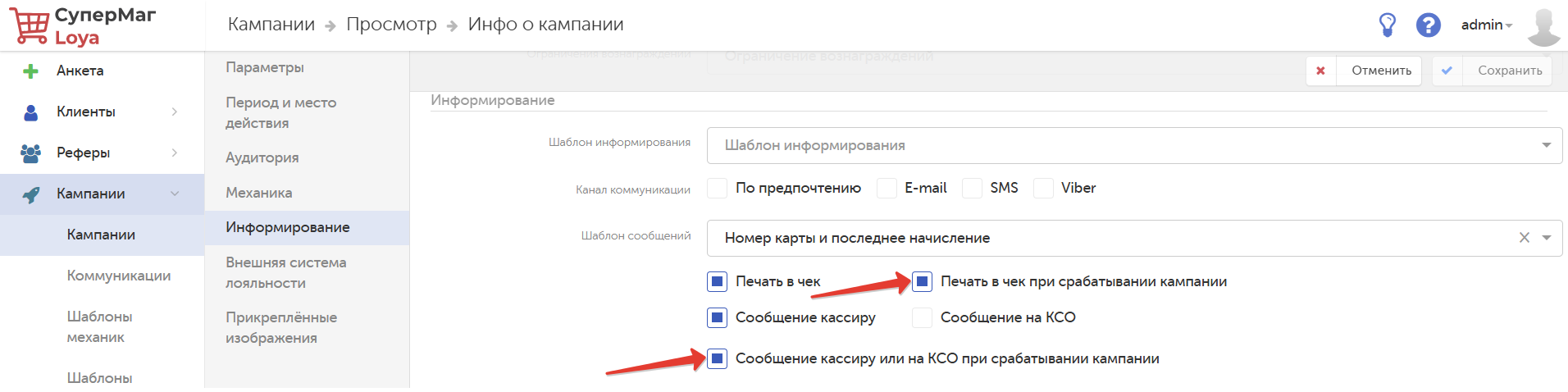 Для того чтобы ни чеки, ни экран кассира (или киоска/КСО) не были перегружены сообщениями об активных кампаниях, некоторые их которых, могут оказаться нерелевантными для конкретного клиента, в настройках кампании можно подключить две дополнительные опции, позволяющие выводить сообщение о маркетинговой акции на экран и в чек лишь в том случае, когда она действительно срабатывает для клиента, чек которого оформляется на кассе: