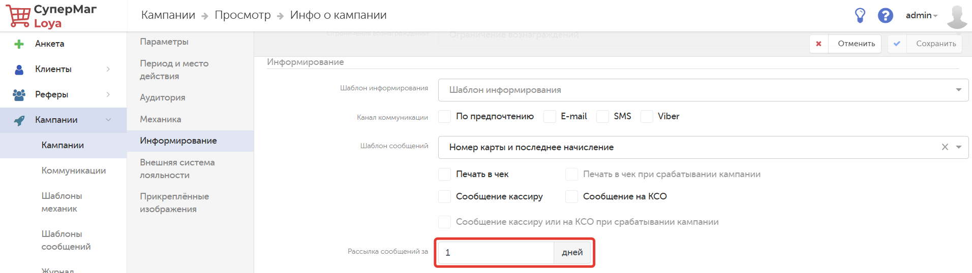 В поле Рассылка сообщений за ... дней можно указать количество дней до даты старта кампании, за которое система отправит информационное сообщение клиенту: