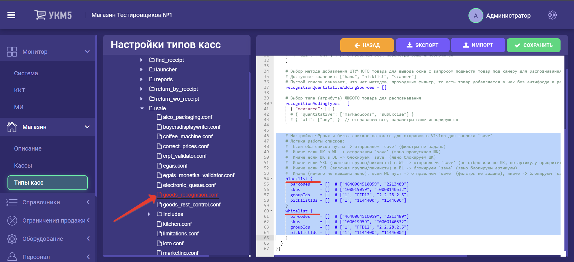 # Настройка чёрных и белых списков на кассе для отправки в Vision для запроса `save`